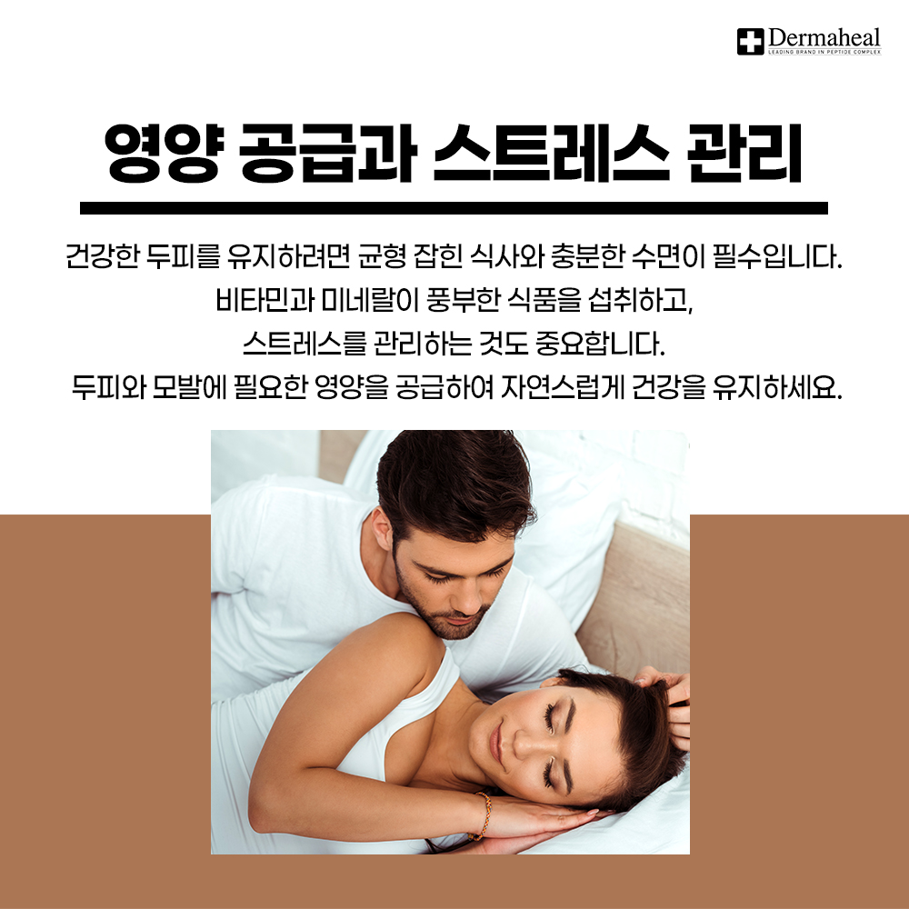 균형 잡힌 식사와 충분한 수면이 건강한 두피를 만듭니다. 비타민과 미네랄이 풍부한 식품을 섭취하고 스트레스를 관리하여 두피와 모발의 건강을 유지하세요.