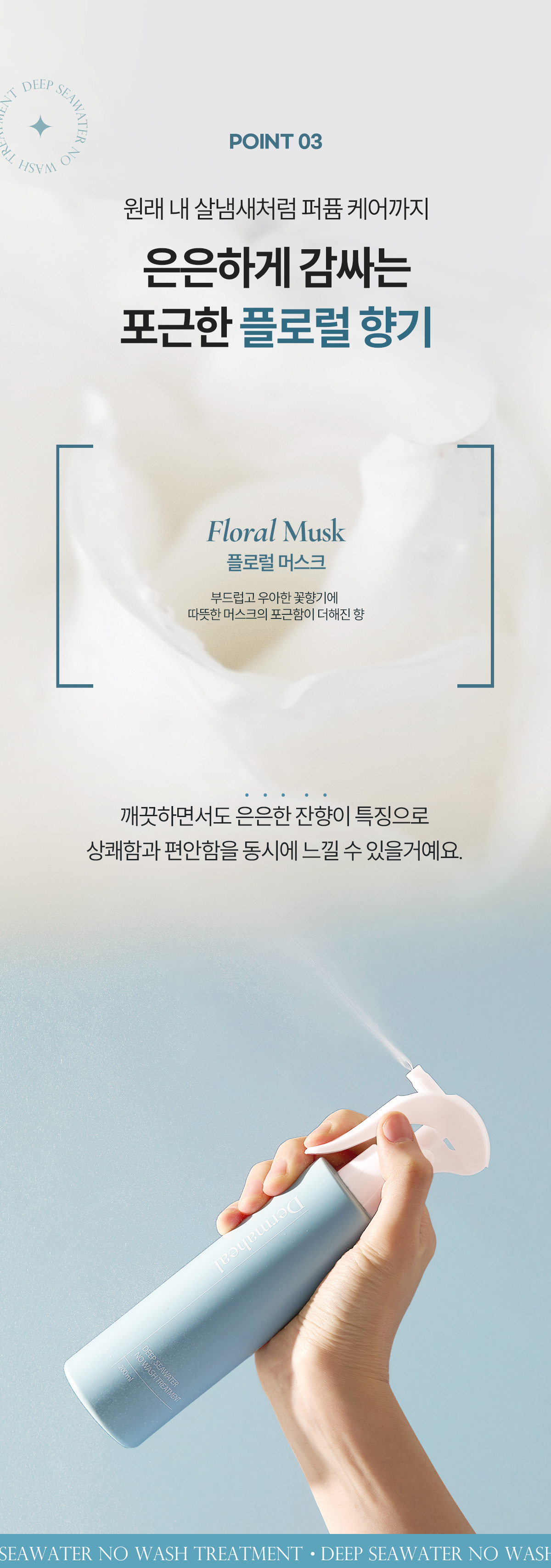 | 주요성분 | 해수(78.4%), 정제수, 세틸알코올, 1,2-헥산다이올, 에탄올, 미리스틸알코올, 아모다이메티콘, 베헨트라이모늄클로라이드, 페녹시에탄올, 세트리모늄클로라이드, 에틸헥실글리세린, 아이소프로필알코올, 트라이데세스-12, 향료, 부틸렌글라이콜, 알파-아이소메틸아이오논, 카퍼트라이펩타이드-1, 제라니올, 시트릭애씨드, 리날룰, 옥타펩타이드-2, 하이드롤라이즈드실크, 리모넨, 글리세린, 시트로넬올, 라우릴알코올, 돌콩오일, 다이소듐이디티에이, 하이드로제네이티드포스파티딜콜린, 세라마이드엔피, 소듐올리에이트, 에스에이치-올리고펩타이드-2, 에스에이치-폴리펩타이드-1, 에스에이치-폴리펩타이드-11, 에스에이치-폴리펩타이드-9, 에스에이치-폴리펩타이드-2, 바이오틴 |